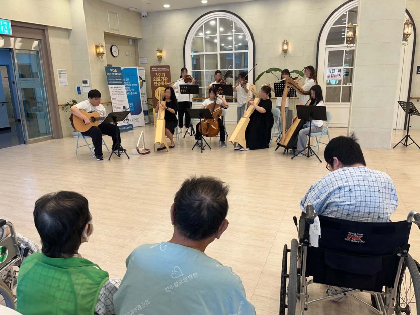 하프, 바이올린, 플루트, 첼로, 기타 등 다채로운 악기의 하모니로 환자분들에게 잊지 못할 감동을 전해드렸고, 연주에 맞춰 손뼉을 치시며 환하게 웃으시며 즐겨주셨습니다.