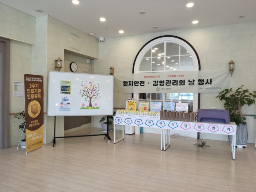 로비에는 환자안전 홍보자료와 퀴즈존, 감염예방 안내 부스가 마련되어 환자분과 직원들이 함께 참여하며 웃음과 배움이 함께한 시간이 되었습니다.